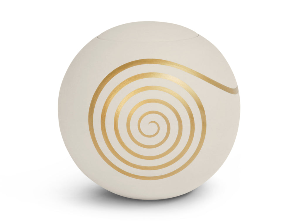 sfera bianca© is a water urn made from valuable materials with a felt flap at the bottom. Each urn is a handcrafted unique piece and is available in a dissolvable, biodegradable form for a sea or river burial. The color white symbolizes innocence, spiritual purity, and wisdom. Gold is the color of supernatural abilities and represents the feminine principle and intuition.