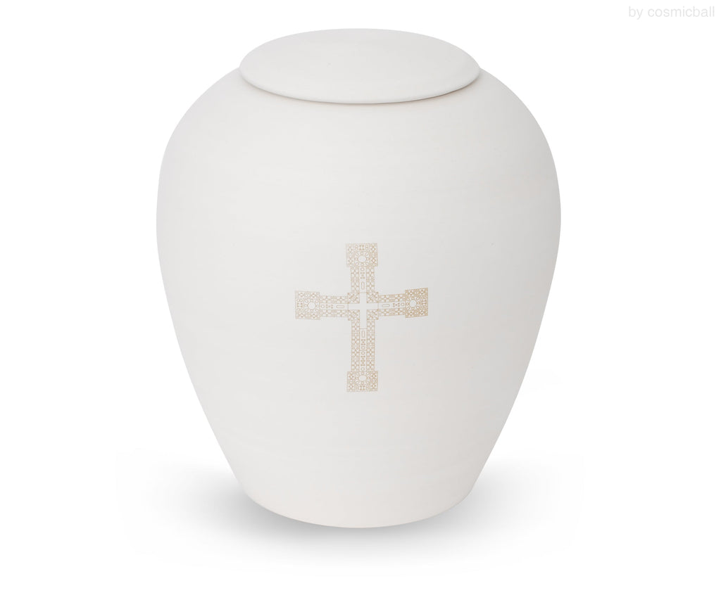 Die urne© «Hannah Goldkreuz» ist eine schlichte, naturweisse Tonurne und ein handgefertigtes Einzelstück. Das hebräische Wort "Hannah" hat mehrere Bedeutungen und Interpretationen - insbesondere "Schönheit" oder "Leidenschaft". Der Name "Hannah" ist zudem ein Palindrom, was bedeutet, dass dieser von beiden Seiten gelesen werden kann und somit das Werden und Vergehen unseres Seins zum Ausdruck bringt. Das Kreuz symbolisiert durch die horizontale Linie die Erde und deutet durch die vertikale Linie auf den Himmel hin. Die Verbindung der beiden Linien zu einem Kreuz symbolisiert so die gleichmässige Verbindung von Himmel und Erde. Die urne© «Hannah Goldkreuz» ist für eine Erdbestattung in einem Urnengrab geeignet und passt auch in eine herkömmliche Urnennische.