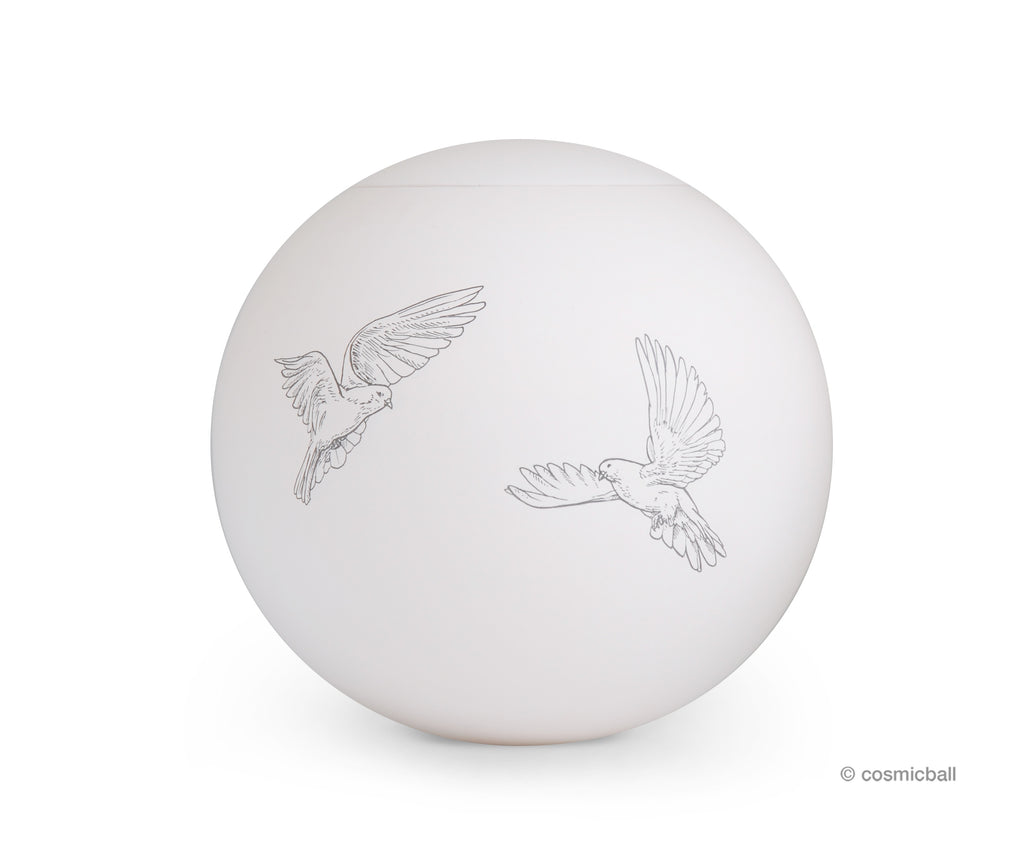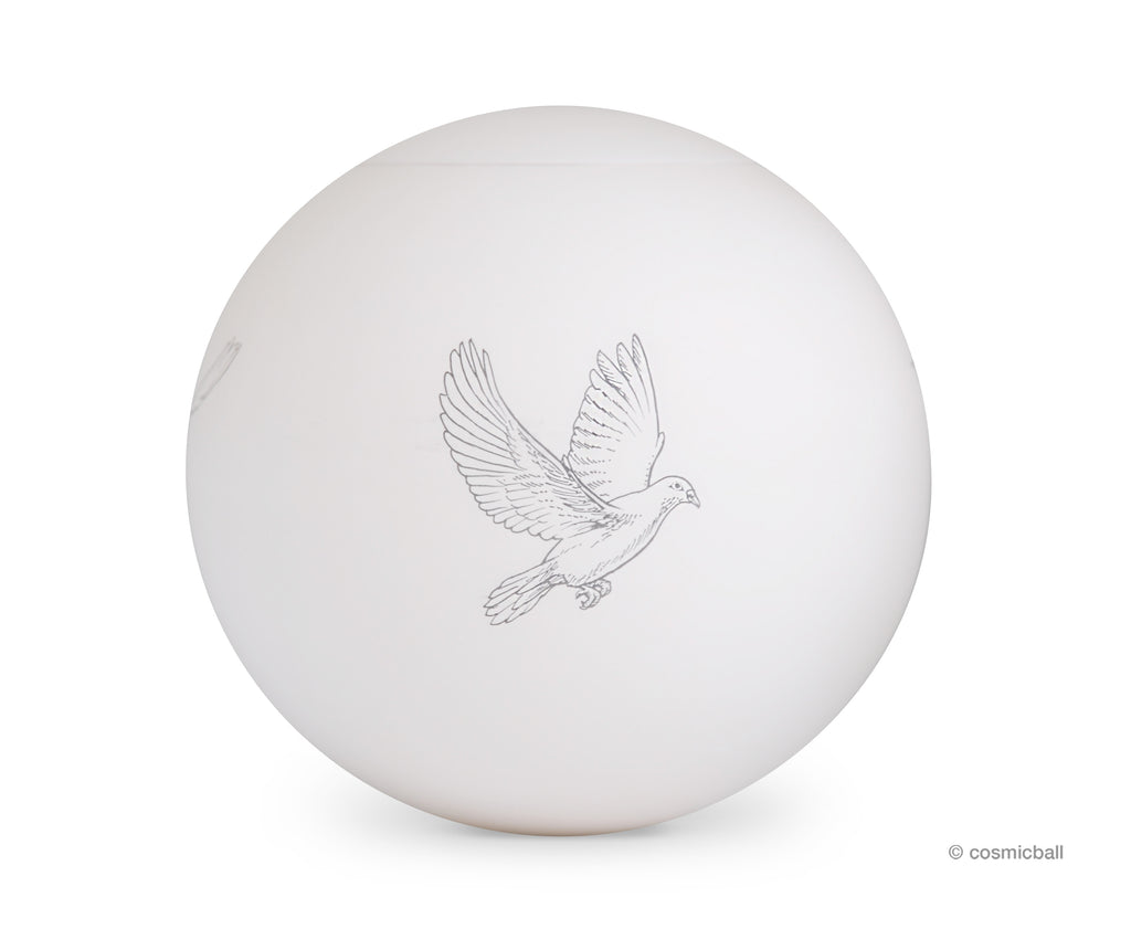 Eine moderne und schlichte Kugelurne aus Steingutton. sfera bianca © wird in Kleinserien aus erstklassigen Materialien hergestellt. Die Taube ist ein Symbol für Frieden, Versöhnung und Reinheit. Diese Tonkugel ist ein handgefertigtes Einzelstück und kann als Andenken an einen lieben Menschen im Wohnbereich platziert werden. Sie passt auch in eine herkömmliche Urnennische (Kolumbarium) und eignet sich auch für eine Erdbestattung in einem Urnengrab.  Diese Urne lässt sich dauerhaft verschliessen oder so, dass sie wieder geöffnet werden kann. Weitere Details zur Entstehungsgeschichte dieser Urne können auf Anfrage beim Künstler «cosmicball» eingeholt werden. Diese Urne ist direkt im Atelier Urne.ch erhältlich oder kann als Expressversand auch Privatpersonen zugestellt werden.